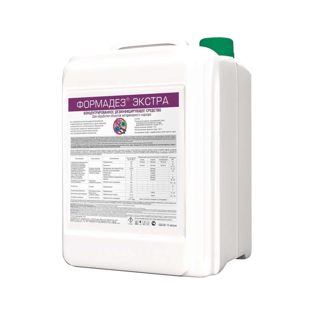 Мощное дезинфицирующее средство Формадез Экстра обладает широким спектром антимикробного действия в отношении большинства грамположительных и грамотрицательных бактерий, вирусов (включая вирус гриппа птиц, вирус инфекционной анемии цыплят, респираторно репродуктивного синдрома, класси- ческой и африканской чумы свиней, цирковирусной инфекции свиней, ящура и др.) и грибов (включая дрожжи, спорообразующие формы, плесень и грибы рода кандида). Средство эффективно против патоге- нов I–IV групп устойчивости. Принцип работы средства заключается в том, что Формадез Экстра вступает в реакцию с аминогруппами белков микроорганизмов и нарушает окислительно-восстановительные процес- сы в микробной клетке.
